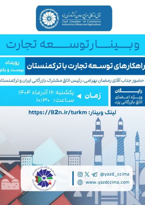 اتاق بازرگانی صنایع، معادن و کشاورزی یزد میزبان دوره های مختلف آموزشی است. همچنین میتوانید از جدیدترین رویدادها و نمایشگاه های تجاری در ایران و دنیا مطلع شوید.